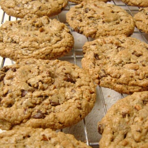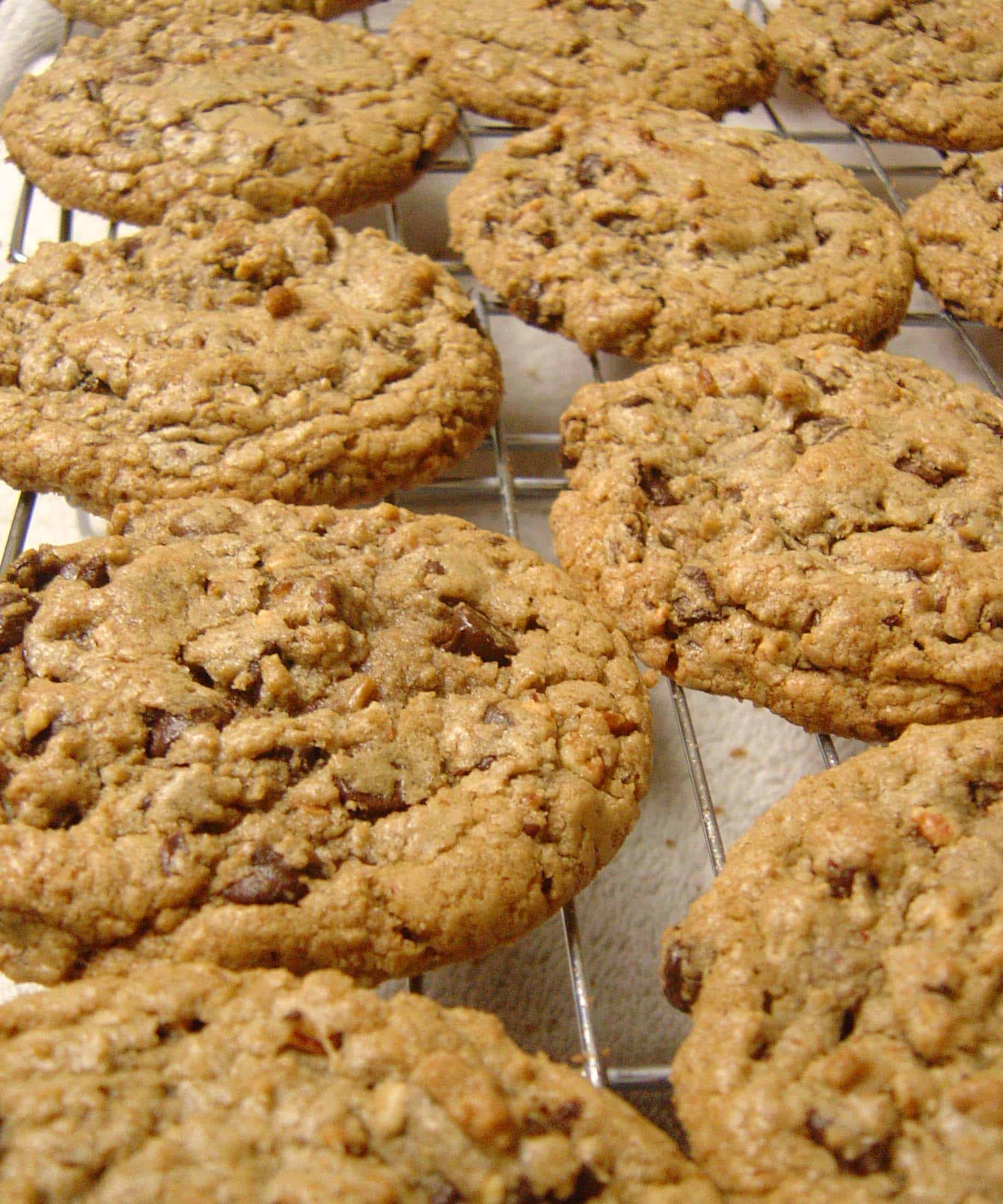 - In a large bowl, cream together the butter, brown sugar and white sugar until smooth. Beat in eggs one at a time then stir in vanilla. Combine the flour, baking soda. Stir into the creamed mixture until just blended. Mix in the oats and chocolate chips. Drop by heaping spoonfuls onto ungreased baking sheets. You can also bake in 2 small cake pans at 350o for 15-30 minutes. Bake for 12 minutes. Allow cookies to cool on baking sheet for 5 minutes before transferring to a wire rack to cool completely.