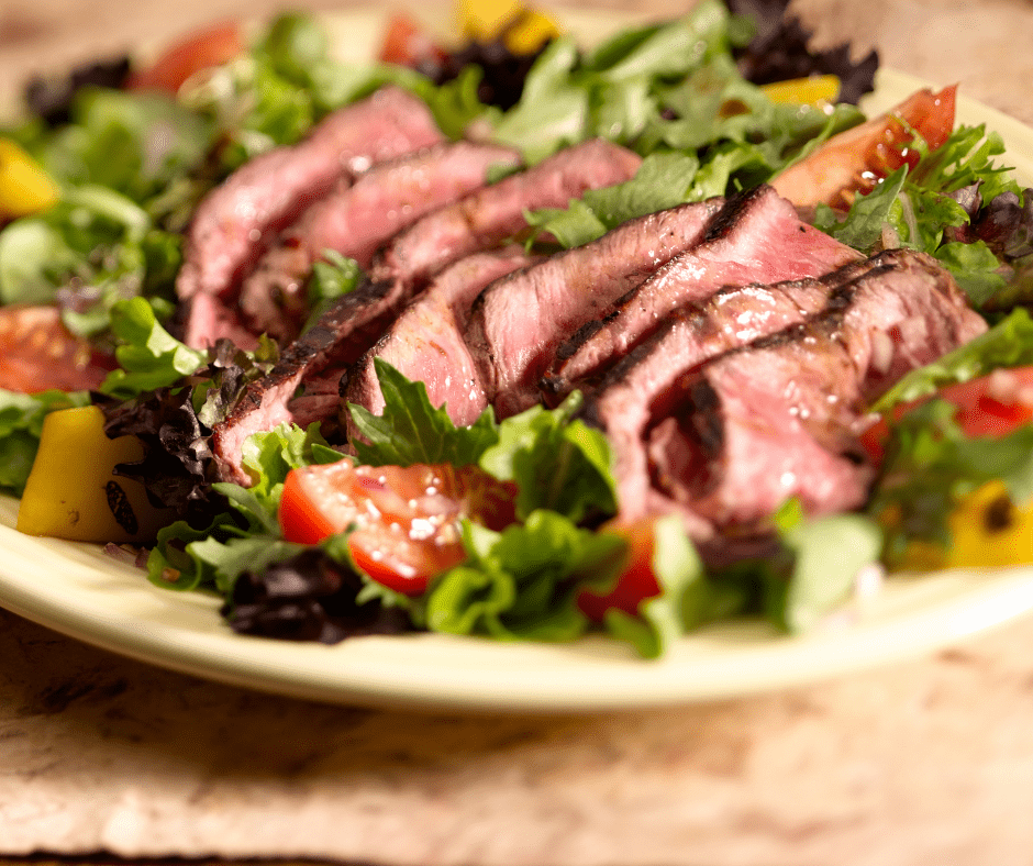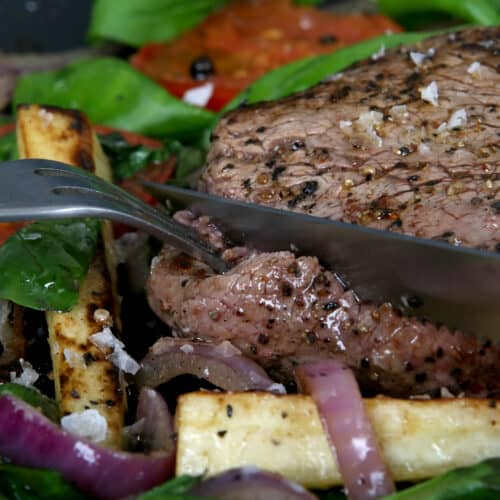- You can use any steak cut that is tender with lots of marbling (skirt, rib eye, sirloin, strip loin) boneless, 1to 2 “ thick (approximately 14 to 20 oz total for 2pieces) Depends how much steak you like!Lay the steaks on a plate and generously sprinkle steak spice and finely chopped garlic on top. Set aside on the counter for 1 hour before cooking. Pan fry the steaks in avocado oil until medium rare. (Not bloody). Remove to a cutting board.Deglaze the pan with a generous amount of balsamic vinegar,t o which you add 1 pint of cherry tomatoes. Cook until vinegar thickens and tomatoes are plumped up. Add a little olive oil as this becomes the salad dressing. Slice the steak crosswise into thin slices for 4 servings.